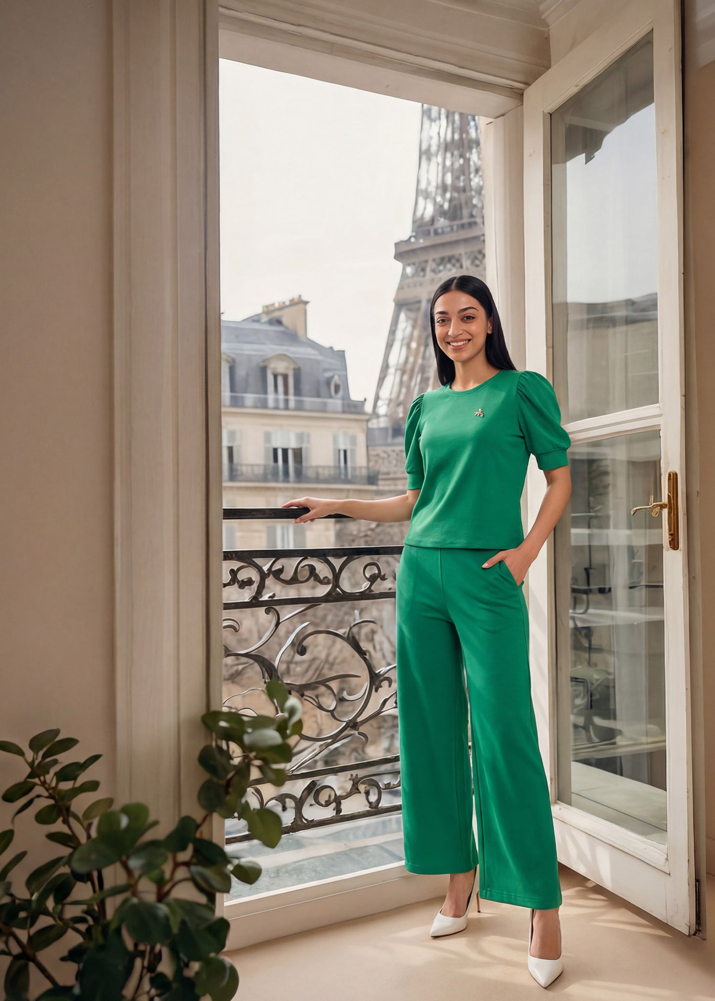 Elegance Redefined: 100% Cotton, Pouf Sleeve, Ribbed Contrast, and Dazzling Rhinestone Brooch.Elevate your wardrobe with stylish pouf sleeves that add an extra touch of sophistication and glamour to any outfit. These beautifully designed sleeves bring a dramatic flair, adding volume and visual interest to your overall look. Perfect for making a statement, pouf sleeves are a must-have detail for anyone seeking to elevate their fashion game.